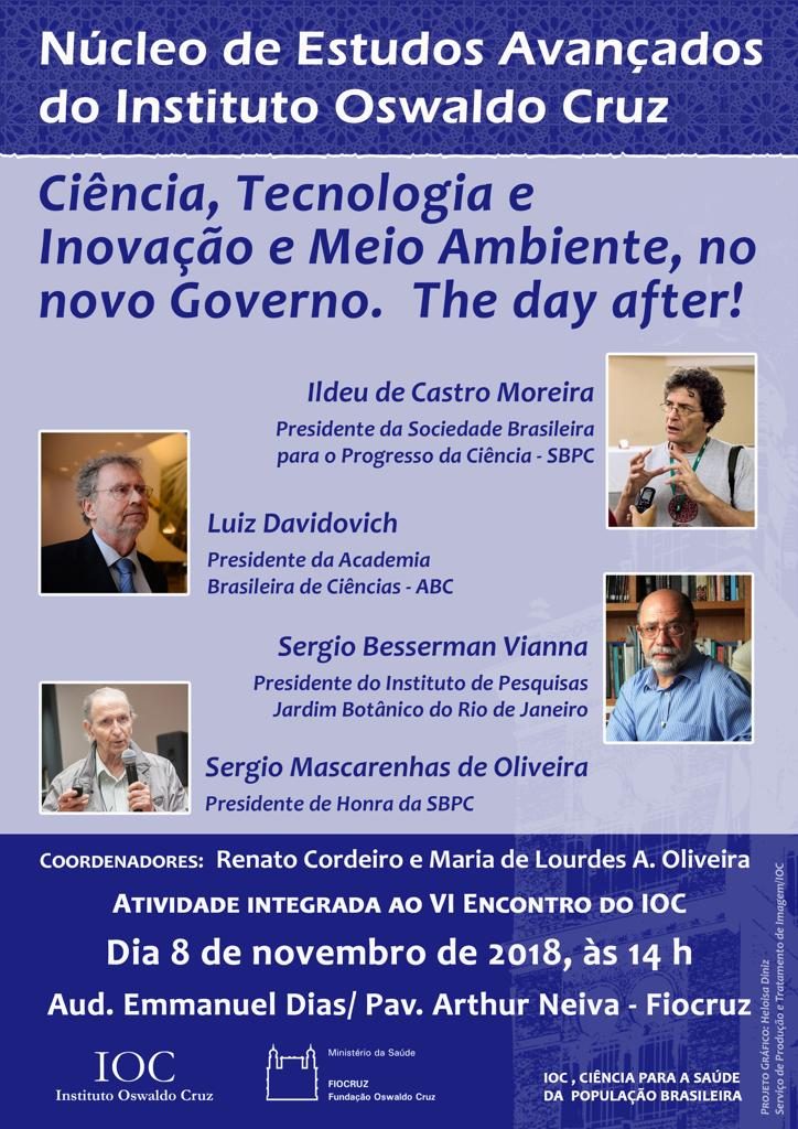 No contexto do VI Encontro do Instituto Oswaldo Cruz, o Núcleo de Estudos Avançados da organização realizará o evento “Ciência, Tecnologia e Inovação e Meio Ambiente, no novo Governo. The day after!”. Com a participação de grandes nomes da comunidade científica, o debate acontecerá no dia 8 de novembro, às 14h, no Auditório Emmanuel Dias, da Fiocruz.