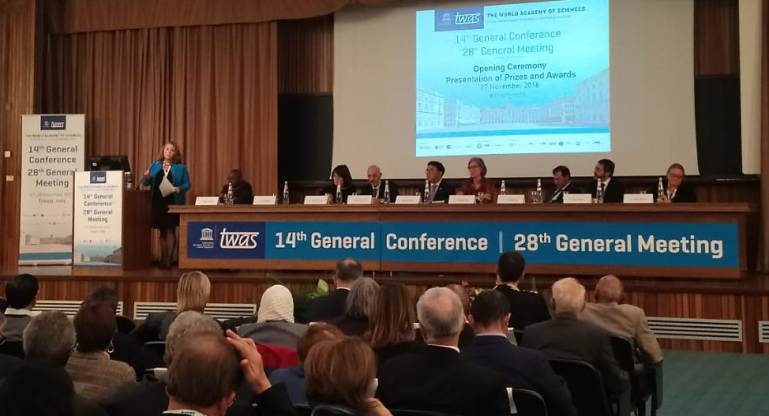 A mesa da Reunião Geral foi composta por Ylann Schemm (Elsevier), no púlpito; o diretor-executivo da TWAS Romain Murenzi; a Conselheira Regional de Pesquisa, Alessia Rosolen; o representante do Ministério do Exterior e Cooperação Internacional Fabrízio Nicoletti; o presidente da TWAS, Bai Chunli; a representante da Unesco Flávia Schlegel; o representante da National Academy os Sciences (EUA) Vaughan Turekian; o diretor do Abdus Salam International Centre for Theoretical Physics (ICTP), Fernando Quevedo e a representante da Sweden International Development Cooperation (SIDA) Eva Ohlsson.
