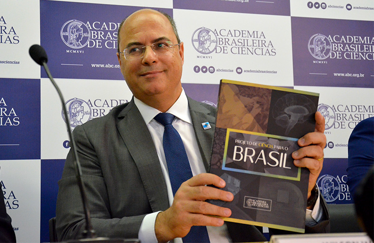 O governador do estado do Rio de Janeiro, Wilson Witzel, com o documento elaborado pela ABC, Projeto de Ciência para o Brasil.