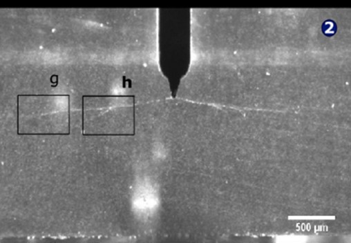Figura indica a propagação da trinca em um plano perpendicular ao de carregamento mecânico, muito similar ao que aconteceria quando se ensaia, por exemplo, um pedaço de bambu.