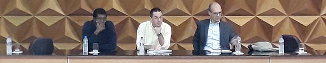 Os palestrantes foram o analista ambiental André Luiz Naime (Ibama); Bruno Milanez, professor do Departamento de Engenharia e Mecânica do Departamento de Geografia da Universidade Federal de Juiz de Fora (UFJF) e Edmilson Teixeira, professor titular do Programa de Pós-graduação do Departamento de Engenharia Ambiental, coordenando o de Gestão de Recursos Hídricos e Desenvolvimento Regional (LabGest) da Universidade Federal do Espírito Santo (UFES).
