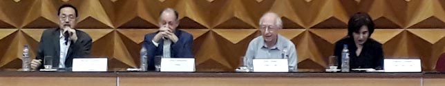 O quarto e último painel do dia 2 de abril foi coordenado pelo Acadêmico Nivio Ziviani, doutorado em ciência da computação pela Universidade de Waterloo, no Canadá, e professor emérito da UFMG. Na mesa de encerramento, o coordenador do evento no Rio de Janeiro, e Acadêmico Edson Watanabe, diretor da Coppe/UFRJ, reuniu-se ao coordenador, ao palestrante Clélio Campolina, ex-ministro de Ciência e Tecnologia (2014-2015) e à coordenadora do evento em Belo Horizonte e palestrante do painel, a Acadêmica Virginia Ciminelli, professora titular do Departamento de Engenharia Metalúrgica e de Materiais da UFMG e coordenadora do INCT-Acqua.