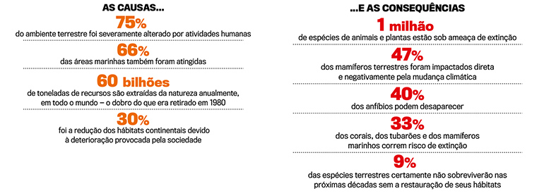 Os humanos vêm deixando marcas de destruição. Um levantamento recente realizado pela ONU compilou 15 mil estudos para retratar a dimensão da devastação ambiental decorrente da civilização. O retrato está nas imagens a seguir.