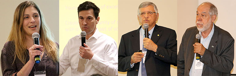 Em um primeiro momento de palestras e provocações na manhã do dia 24, participaram os Acadêmicos Jorge Almeida Guimarães, presidente da Empresa Brasileira de Pesquisa e Inovação Industrial (Embrapii), e Odorico de Moraes, coordenador do Núcleo de Pesquisa e Desenvolvimento de Medicamentos (NPDM) da Universidade Federal do Ceará (UFC); a Acadêmica Fernanda Moll, presidente do Instituto D’Or de Pesquisa e Ensino (IDOR) e membro afiliado da ABC para o período 2015-2019; e o presidente do Instituto Serrapilheira, Hugo Aguilaniu.