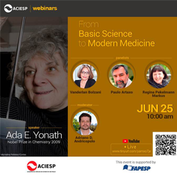 No primeiro encontro, intitulado “From Basic Science to Modern Medicine”, a professora Ada E. Yonath, do Weizmann Institute of Science, em Israel, ganhadora do Prêmio Nobel de Química de 2009; a Acadêmica Vanderlan Bolzani, professora titular do Instituto de Química da Universidade Estadual Paulista (Unesp) e presidente da Aciesp; o Acadêmico Paulo Artaxo, professor titular do Instituto de Física da Universidade de São Paulo (USP) e vice-presidente da Aciesp; a Acadêmica Regina Pekelmann Markus, professora titular do Instituto de Biociências da USP e pesquisadora sênior do CNPq, abrirão o ciclo de webinários. A mediação será de Adriano Andricopulo, membro afiliado da ABC entre 2008 e 2013, professor titular do Instituto de Física de São Carlos da USP e diretor executivo da Aciesp.