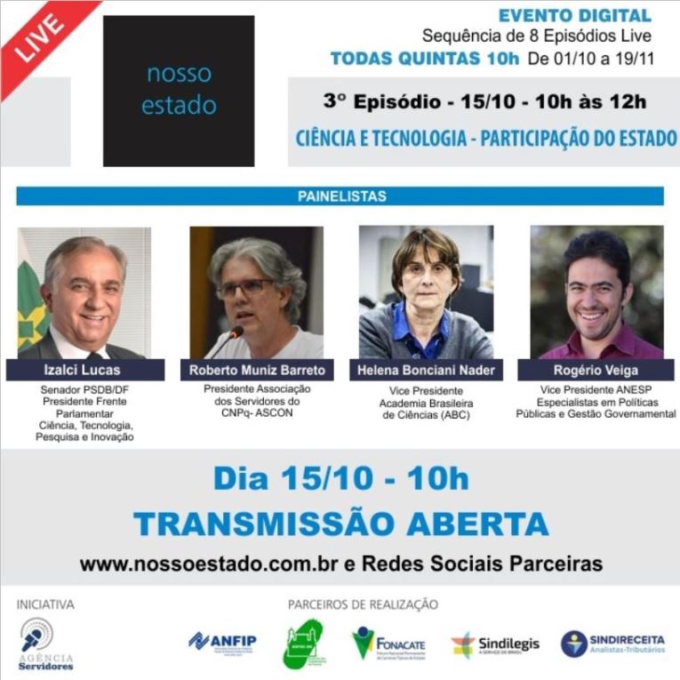 Participarão também o senador Izalci Lucas, presidente da Frente Parlamentar para Ciência, Tecnologia, Pesquisa e Inovação; Rogério Veiga, vice-presidente da Associação Nacional dos Especialistas em Políticas Públicas e Gestão Govenamental (Anesp); e Roberto Muniz Barreto, presidente da Associação dos Servidores do CNPq (Ascon).