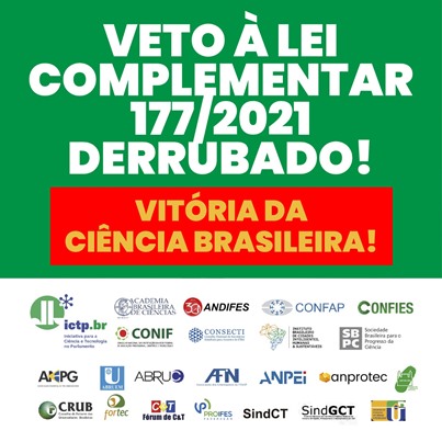 Foi derrubado o item 001 do veto 2/2021, o mais importante para a comunidade científica e acadêmica que se mobilizou junto ao Congresso Nacional, buscando apoio. Este item, vetado pelo presidente da República, impediria o contingenciamento dos valores provenientes de fontes vinculadas ao FNDCT a partir da sanção da lei. Com a derrubada do veto, já neste exercício os recursos deverão ser disponibilizados.