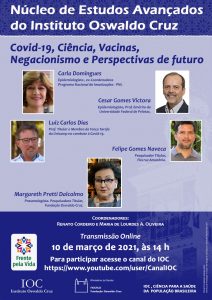 O Núcleo de Estudos Avançados do Instituto Oswaldo Cruz (IOC/Fiocruz) promove, no dia 10/3 às 14h, a sessão “Covid-19, Ciência, Vacinas, Negacionismo e Perspectivas de Futuro”. A transmissão online ocorrerá através do canal do Youtube do IOC.