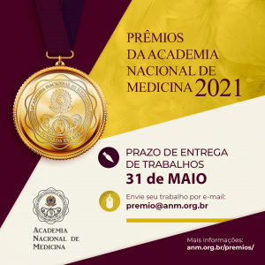Já estão abertas as inscrições para os prêmios 2021 da Academia Nacional de Medicina (ANM), com a data limite de inscrições no dia 31/05/21. Na edição deste ano, serão seis premiações de trabalhos que contribuam para o conhecimento na medicina, dentre eles o Prêmio Academia Nacional de Medicina, na área de Medicina Clínica. Este é o prêmio máximo da ANM e consiste no diploma, medalha e apresentação do trabalho em sessão científica da Academia.
