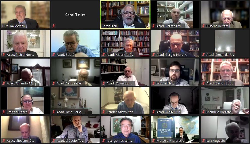O Acadêmico Marcelo Marcos Morales apresentou as diretrizes seguidas pelo Ministério da Ciência, Tecnologia e Informação (MCTI), em especial o núcleo Rede Vírus, durante a pandemia. Entre as estratégias de Pesquisa, Desenvolvimento e Informação (PD&I), estão: a Rede Corona-ômica, para identificação de fatores associados à dispersão e severidade da epidemia; práticas de vigilância epidemiológica em animais silvestres e em águas residuais; e ensaios clínicos como uso de plasma convalescente, soro equino e heparina para tratamento de COVID-19.