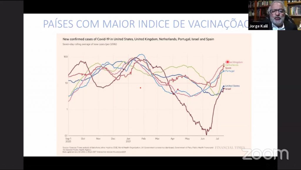 O Acadêmico apresentou um gráfico mostrando o aumento do número de casos de COVID-19 em diversos países após o início da vacinação. Esse aumento pode ser compreendido, dado o fato de que muitos países relaxaram as medidas restritivas após começarem a vacinar. As variantes também contribuíram para o aumento do número de casos, uma vez que os primeiros imunizantes a serem desenvolvidos tomaram como base a cepa de Wuhan. Já imunizantes mais atuais, como a norteamericana Novavax, foram testadas durante a circulação de todas as cepas já existentes.