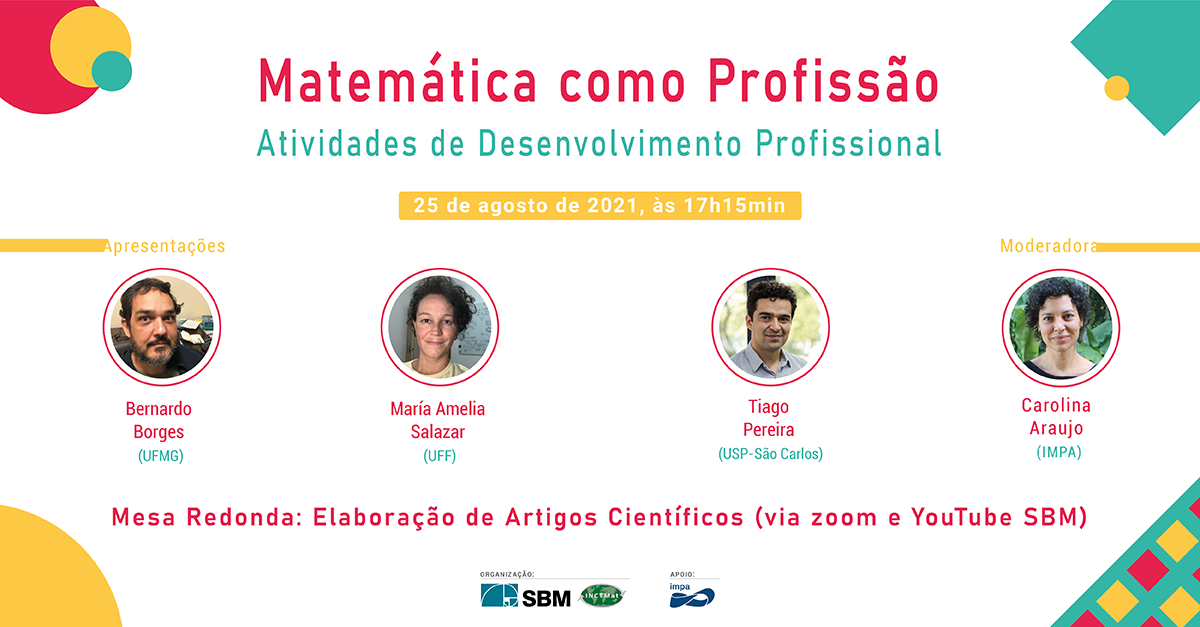 No dia 25 de agosto, às 17:15, o Instituto Nacional de Ciência e Tecnologia de Matemática (INCTMat) e a Sociedade Brasileira de Matemática (SBM) organizam uma mesa redonda virtual com o tema “Elaboração de Artigos Científicos”, da série “Matemática como Profissão”.