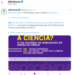 Com grande adesão da sociedade, a manhã foi marcada por um grande “tuitaço” a partir das 10h da manhã. A hashtag #SOSCIENCIA alcançou o topo dos assuntos mais comentados no Brasil na rede social, com mais de 4.800 tweets registrados em uma hora.