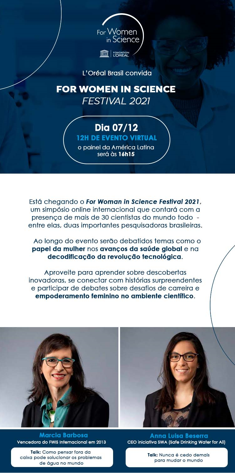 No dia 7 de dezembro, A Fundação L’Oréal e a Unesco organizam mais uma edição do evento que reúne grandes mulheres cientistas do mundo inteiro para um dia inteiro de debates. A iniciativa existe há 20 anos para promover a participação feminina no meio científico. Serão debatidos temas como o papel da mulher nos avanços em saúde globais e na decodificação da revolução tecnológica.