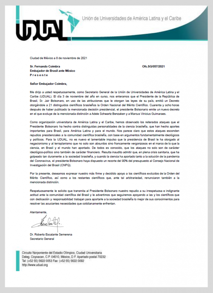 Me dirijo a usted respetuosamente, como Secretario General de la Unión de Universidades de América Latina y el Caribe (UDUAL). El día 3 de noviembre del año en curso, nos enteramos que el Presidente de la República de Brasil, Sr. Jair Bolsonaro, en uso de las atribuciones que le otorgan las leyes de su país, emitió un Decreto otorgándole a 21 distinguidos científicos brasileños la Orden Nacional del Mérito Científico. Cuarenta y ocho horas después de haber publicado la mencionada decisión presidencial, el presidente Bolsonario emite un nuevo decreto en el que excluye de la mencionada distinción a Adele Schwartz Benzaken y a Marcus Vinicius Guimaraes.