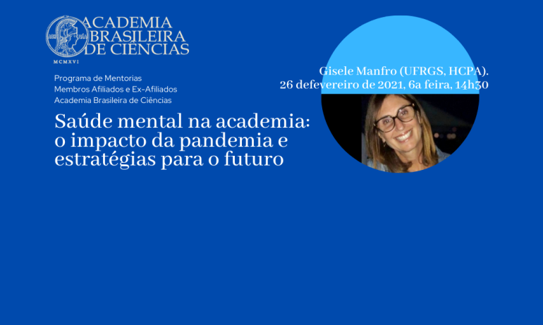 O tema será "Saúde Mental na Academia: o Impacto da Pandemia e Estratégias para o Futuro", com a Profa. Gisele Manfro, do Hospital das Clínicas de Porto Alegre da Universidade Federal do Rio Grande do Sul (UFRGS, HCPA).