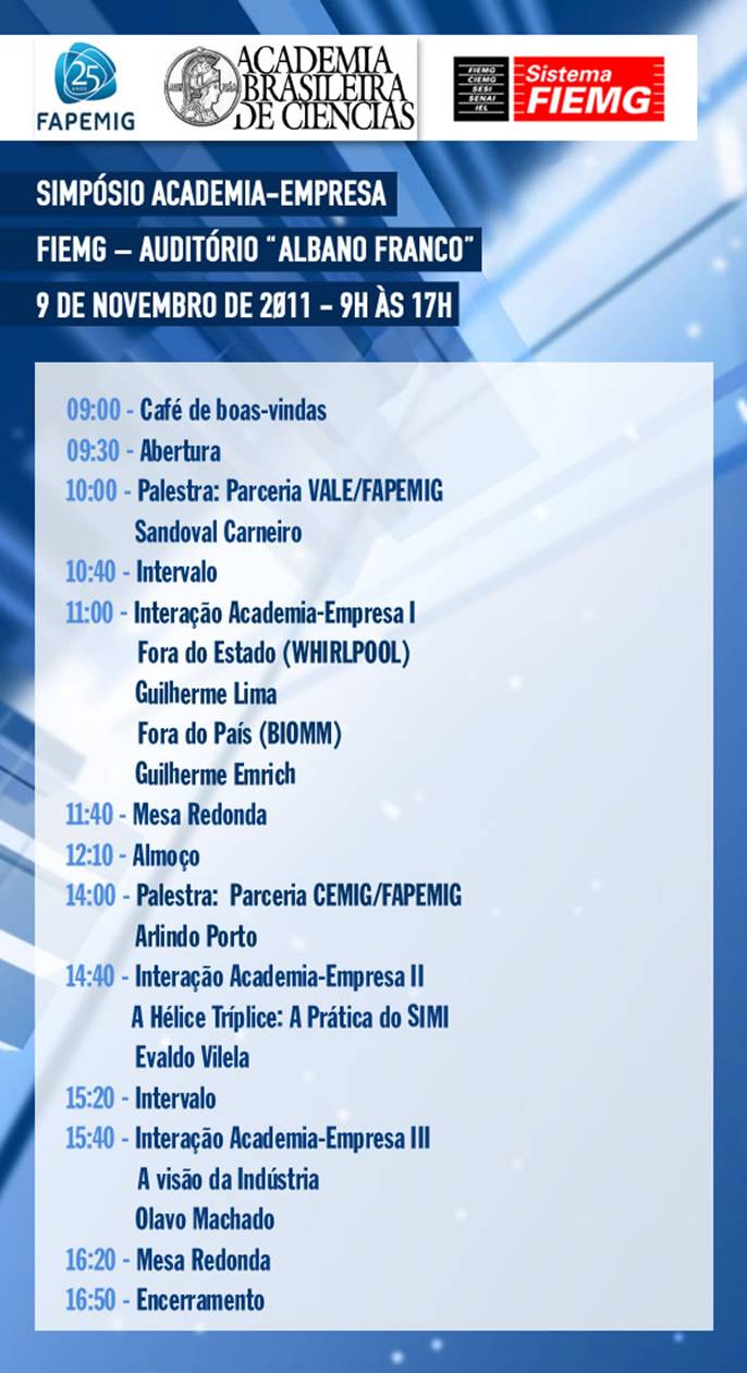 A Academia Brasileira de Ciências (ABC), a Fundação de Amparo à Pesquisa do Estado de Minas Gerais (Fapemig) e a Federação das Indústrias do Estado de Minas Gerais (FIEMG) convidam para o Simpósio Academia-Empresa de Minas Gerais 2011, que visa promover a aproximação da comunidade científica com o setor empresarial, apresentando os planos dessas instituições para o fomento à Ciência, Tecnologia e Inovação. Veja a programação.