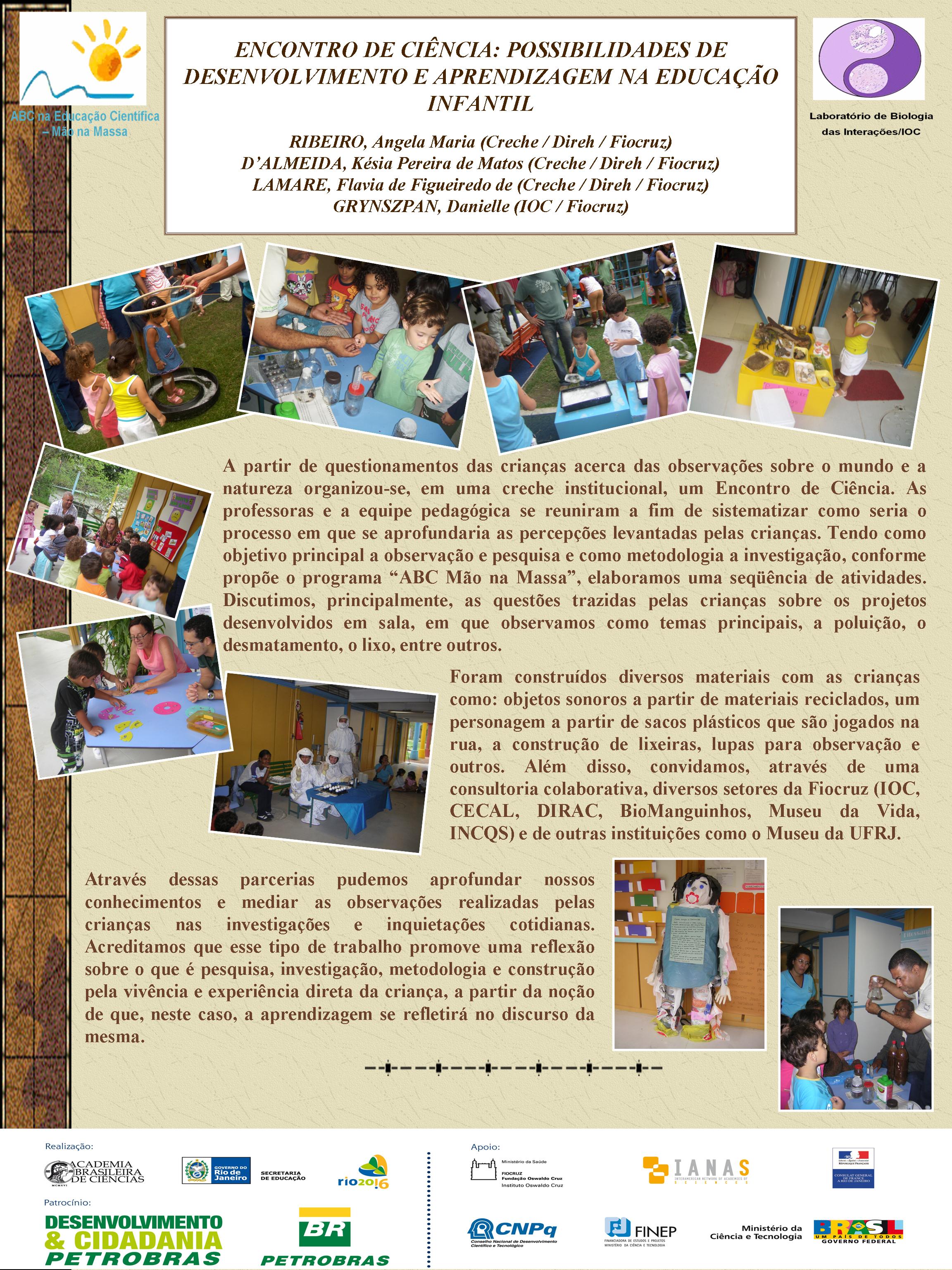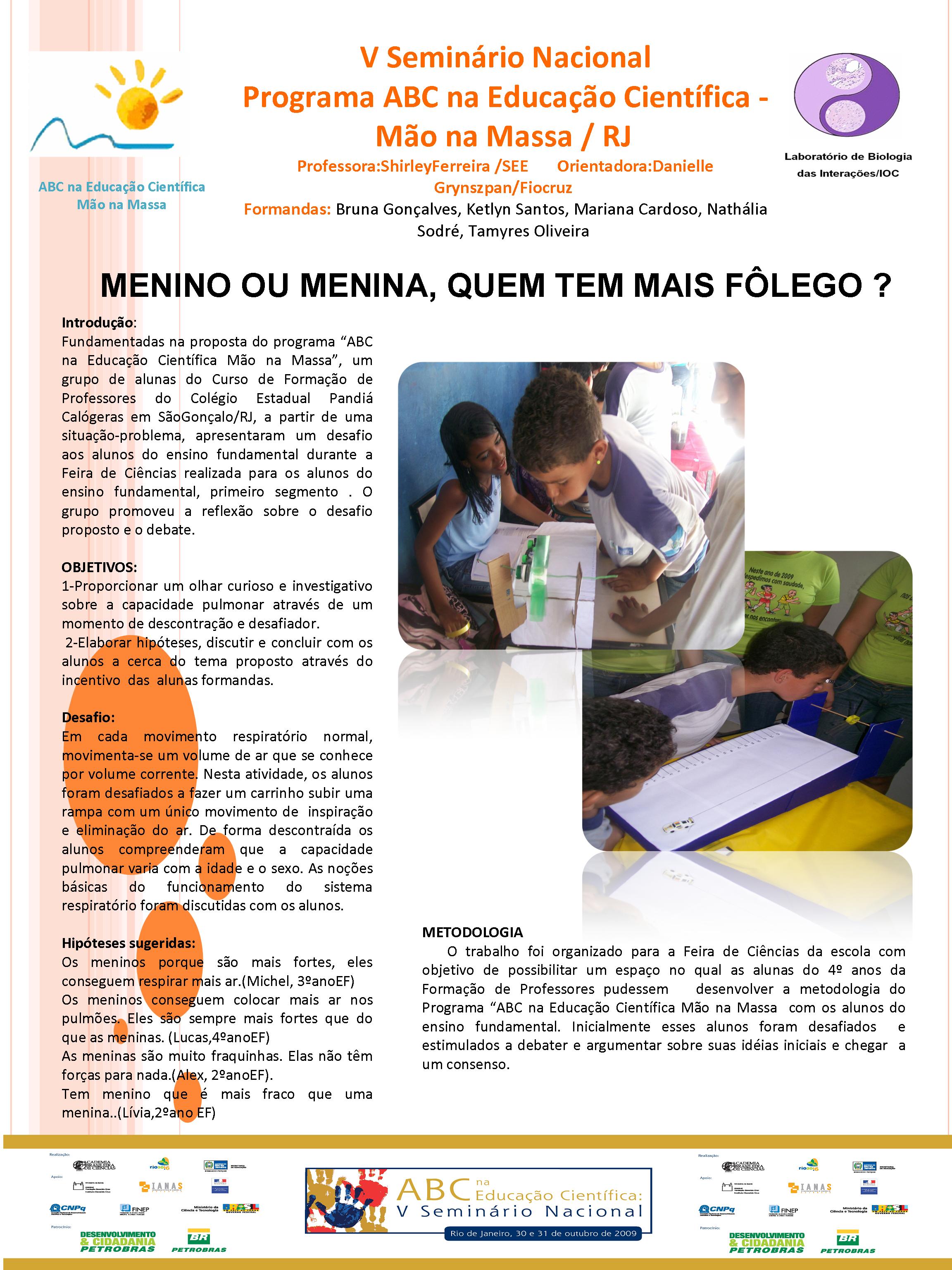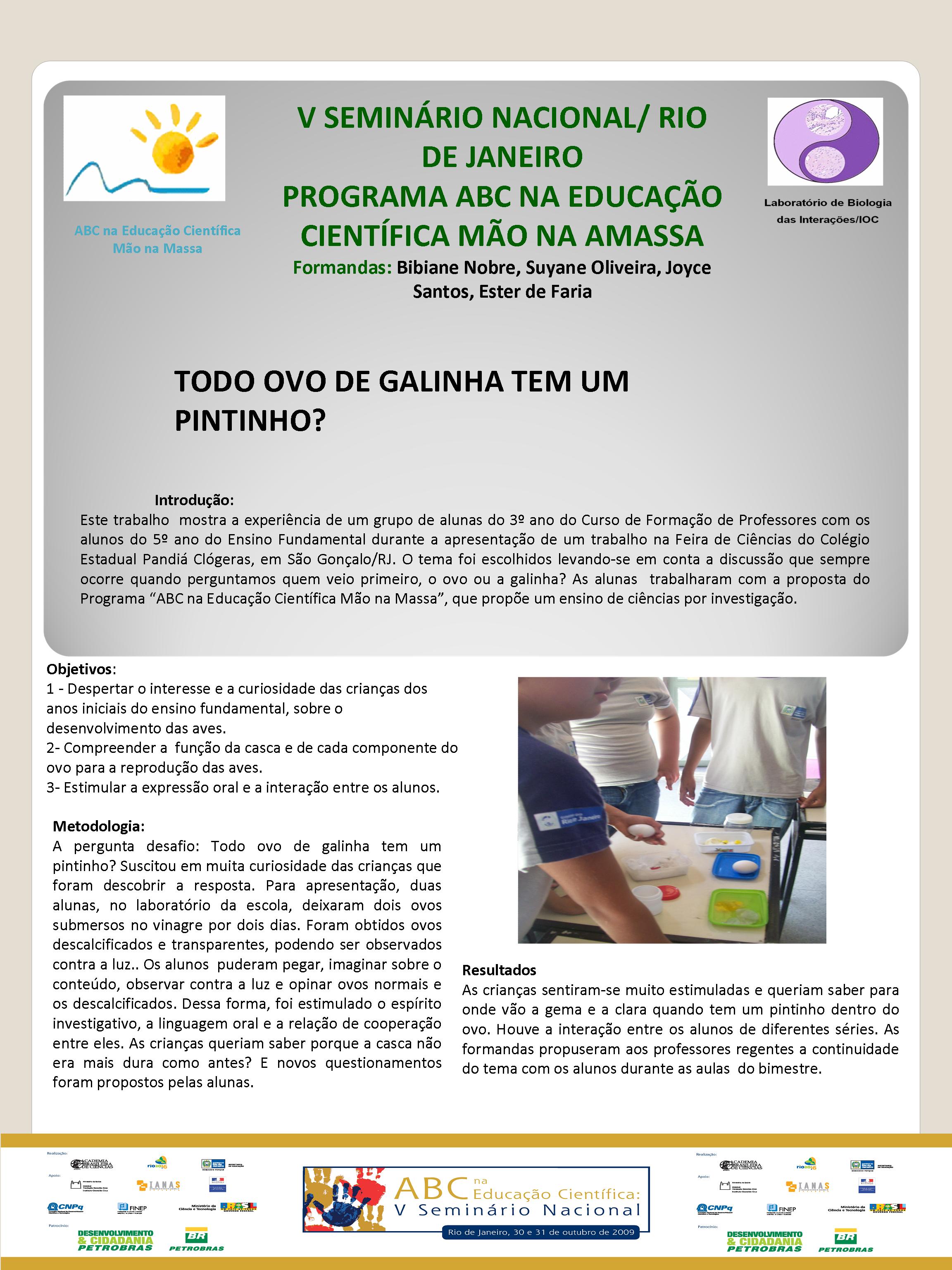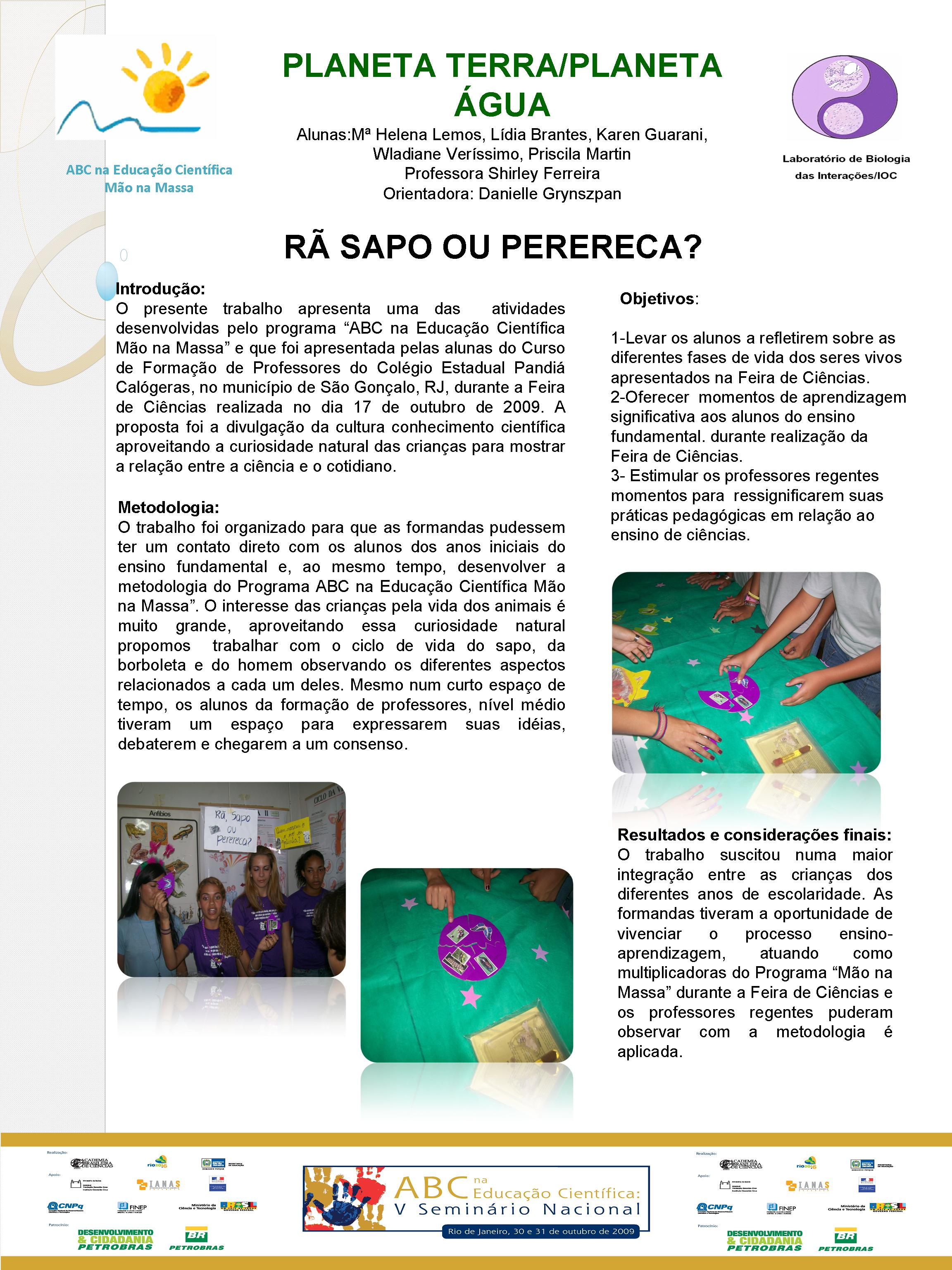 Realizado no Planetário do Rio de Janeiro, o V Seminário Nacional do Programa ABC na Educação Científica, com o patrocínio da Petrobras e apoio da FINEP, do CNPq, discutiu a atuação dos diversos núcleos do Programa, bem como a própria atuação da Academia Brasileira de Ciências na temática de educação em ciências no Brasil. Veja aqui a agenda do evento. O encontro contou com a participação dosacadêmicos Ernst Hamburger, Simon Schwartzman, Alexander Kellner e Diogenes Campos e de diversas pessoas envolvidasno Programa, como os professores Danielle Grynszpan, Aprígio Curvelo, Roseli Lopes e Dietrich Schiel. Também participaram autoridades do Ministério de Educação e da Secretaria de Educação do Estado. Durante o Seminário, também foram apresentadas, por meio de pôsteres, diversas iniciativas na área de educação científica que têm sido tomadas por professores do estado do Rio de Janeiro. Para maiores informações, acesse o relatório acadêmico. Para acessar o Levantamento Diagnóstico, clique aqui. A seguir podem ser acessados alguns dos trabalhos apresentados por pôsteres durante o evento. Afinal, somos iguais ou diferentes Menino ou menina, quem tem mais fôlego? Planeta Terra / Planeta Água Rã, sapo ou perereca? Todo ovo de galinha tem um pintinho? Ciência e arte na educação infantil: trabalhando a dengue com crianças da pré-escola A descoberta: o vento em nossa sala Descobrindo o meio ambiente através do folclore Desenvolvendo estratégias e recursos pedagógicos para a educação infantil Encontro de ciência: possibilidades de desenvolvimento e aprendizagem na educação infantil Preservação do meio ambiente: possibilidades de trabalhos na educação infantil Raízes: um encontro com a identidade e a natureza “Vida de inseto”: a educação infantil em foco Contando “causos”: resgatando histórias Escola limpa – bairro limpo Brincando de aprender matemática Qual o mistério do barbeiro? Ambiente como tema transversal – a diversidade na natureza e na sociedade Sexualidade: se liga nesse lance! De onde vem a água de nosso bairro? Gestão de resíduos integrada à educação ambiental – estratégias para melhoria da qualidade de vida em Miracema, RJ apoio_mao_na_massa.jpg