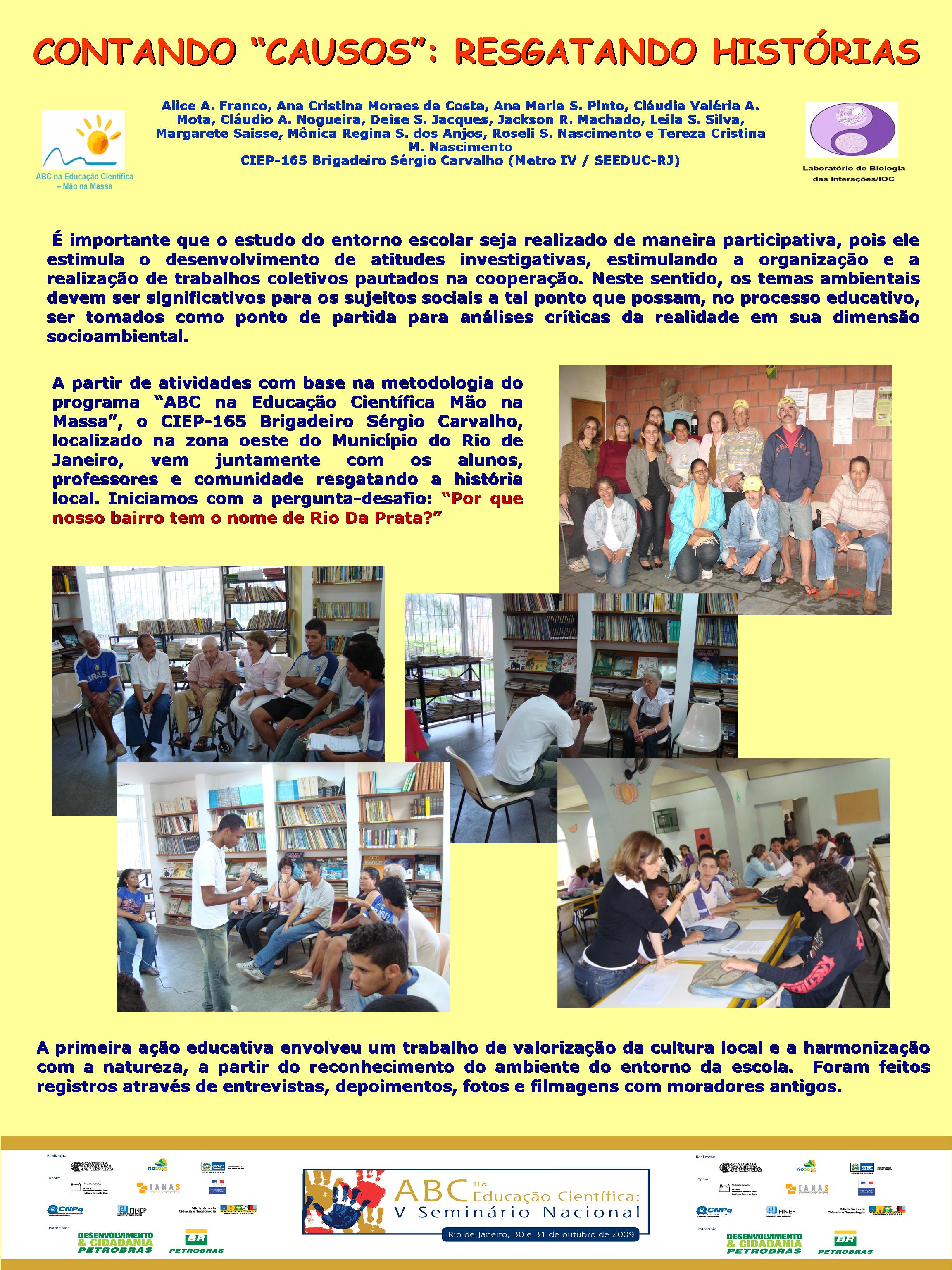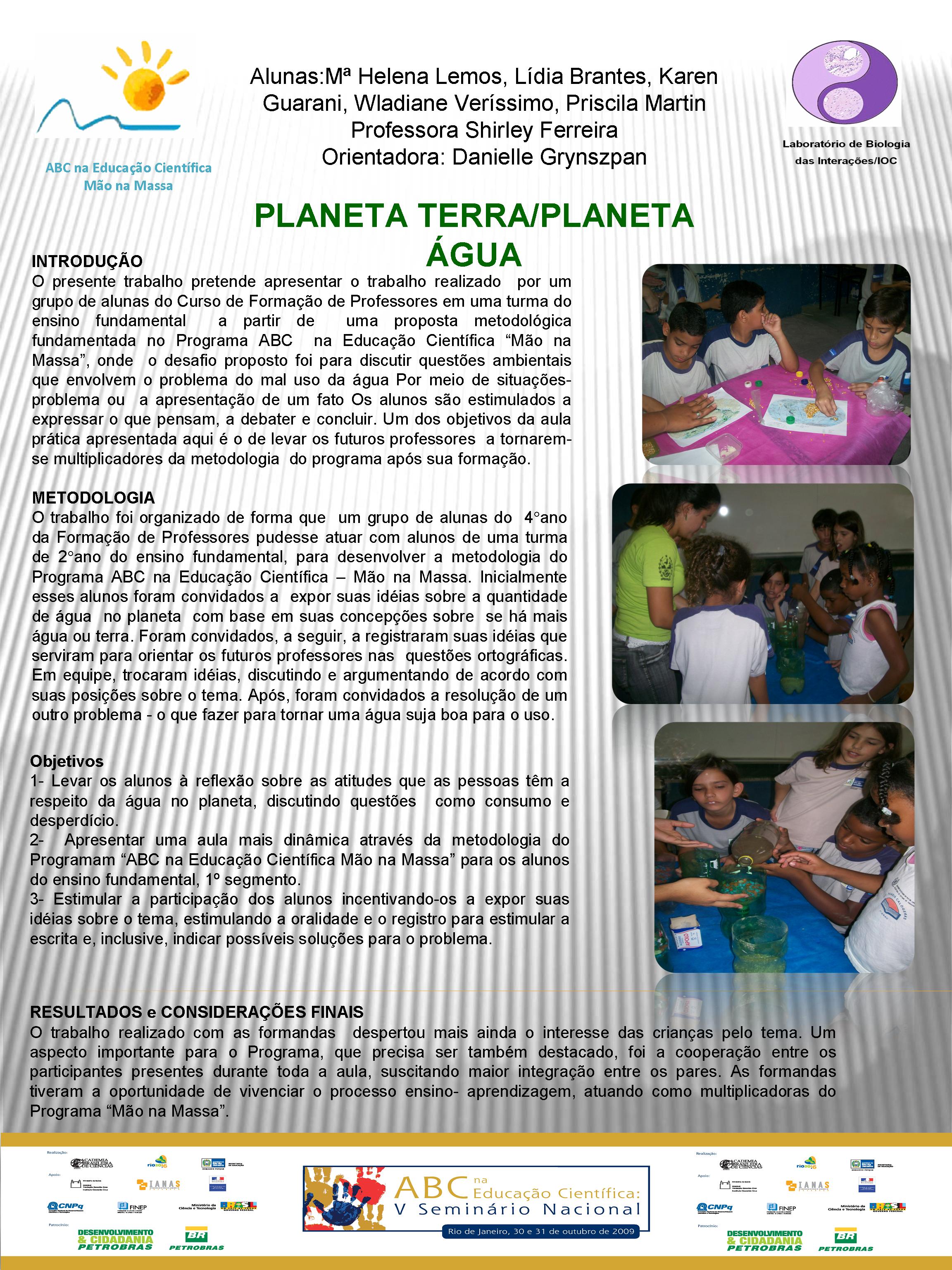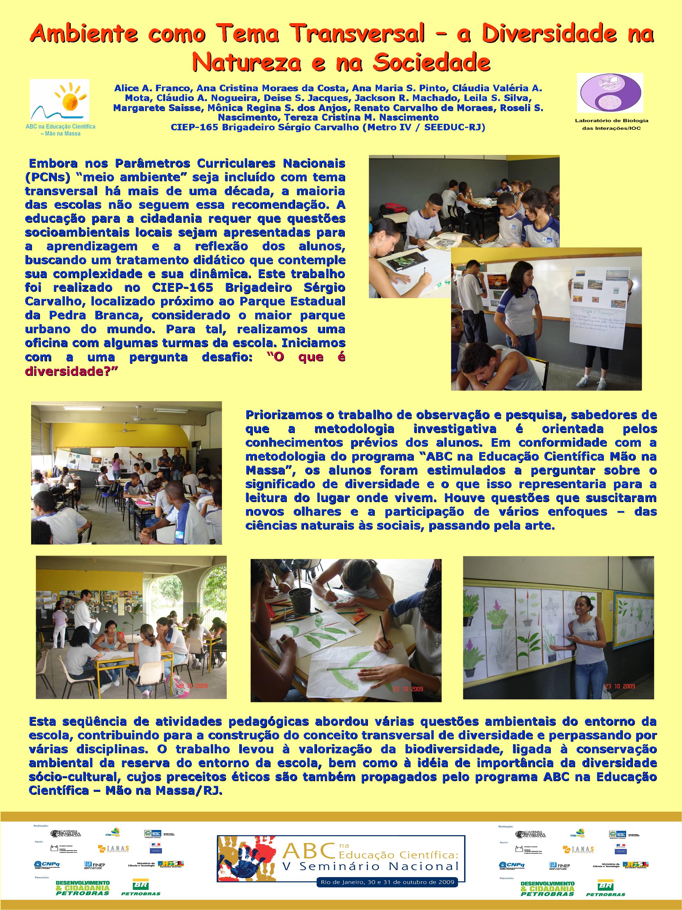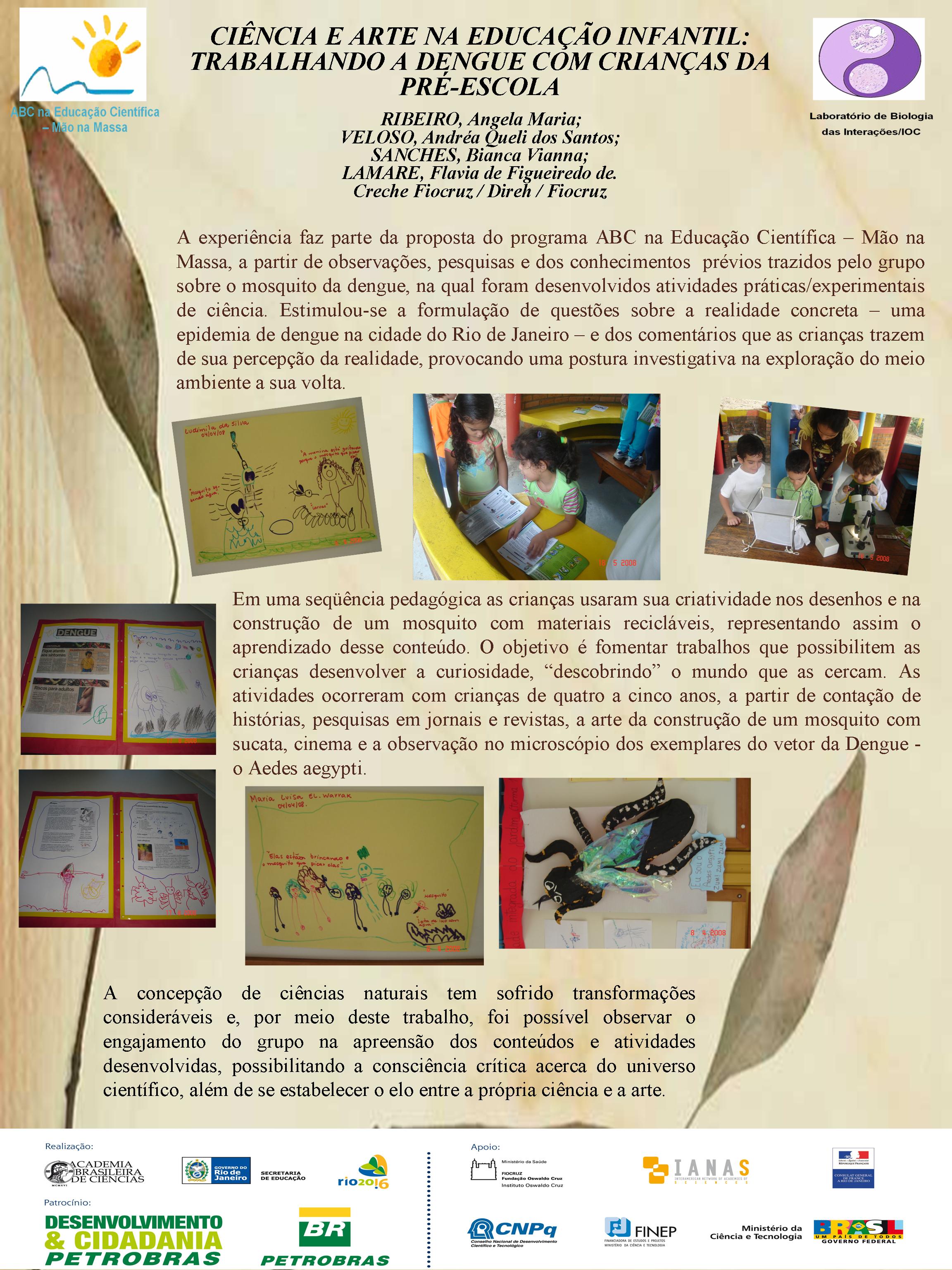 Realizado no Planetário do Rio de Janeiro, o V Seminário Nacional do Programa ABC na Educação Científica, com o patrocínio da Petrobras e apoio da FINEP, do CNPq, discutiu a atuação dos diversos núcleos do Programa, bem como a própria atuação da Academia Brasileira de Ciências na temática de educação em ciências no Brasil. Veja aqui a agenda do evento. O encontro contou com a participação dosacadêmicos Ernst Hamburger, Simon Schwartzman, Alexander Kellner e Diogenes Campos e de diversas pessoas envolvidasno Programa, como os professores Danielle Grynszpan, Aprígio Curvelo, Roseli Lopes e Dietrich Schiel. Também participaram autoridades do Ministério de Educação e da Secretaria de Educação do Estado. Durante o Seminário, também foram apresentadas, por meio de pôsteres, diversas iniciativas na área de educação científica que têm sido tomadas por professores do estado do Rio de Janeiro. Para maiores informações, acesse o relatório acadêmico. Para acessar o Levantamento Diagnóstico, clique aqui. A seguir podem ser acessados alguns dos trabalhos apresentados por pôsteres durante o evento. Afinal, somos iguais ou diferentes Menino ou menina, quem tem mais fôlego? Planeta Terra / Planeta Água Rã, sapo ou perereca? Todo ovo de galinha tem um pintinho? Ciência e arte na educação infantil: trabalhando a dengue com crianças da pré-escola A descoberta: o vento em nossa sala Descobrindo o meio ambiente através do folclore Desenvolvendo estratégias e recursos pedagógicos para a educação infantil Encontro de ciência: possibilidades de desenvolvimento e aprendizagem na educação infantil Preservação do meio ambiente: possibilidades de trabalhos na educação infantil Raízes: um encontro com a identidade e a natureza “Vida de inseto”: a educação infantil em foco Contando “causos”: resgatando histórias Escola limpa – bairro limpo Brincando de aprender matemática Qual o mistério do barbeiro? Ambiente como tema transversal – a diversidade na natureza e na sociedade Sexualidade: se liga nesse lance! De onde vem a água de nosso bairro? Gestão de resíduos integrada à educação ambiental – estratégias para melhoria da qualidade de vida em Miracema, RJ apoio_mao_na_massa.jpg