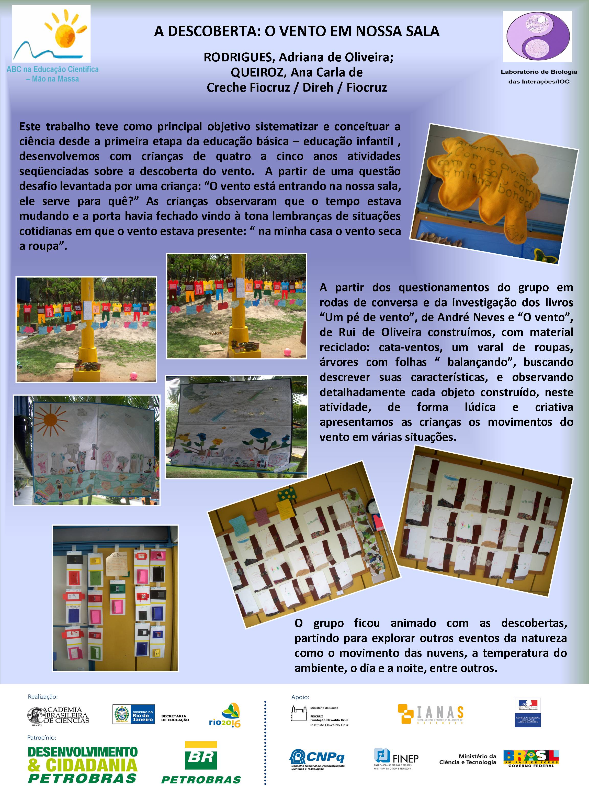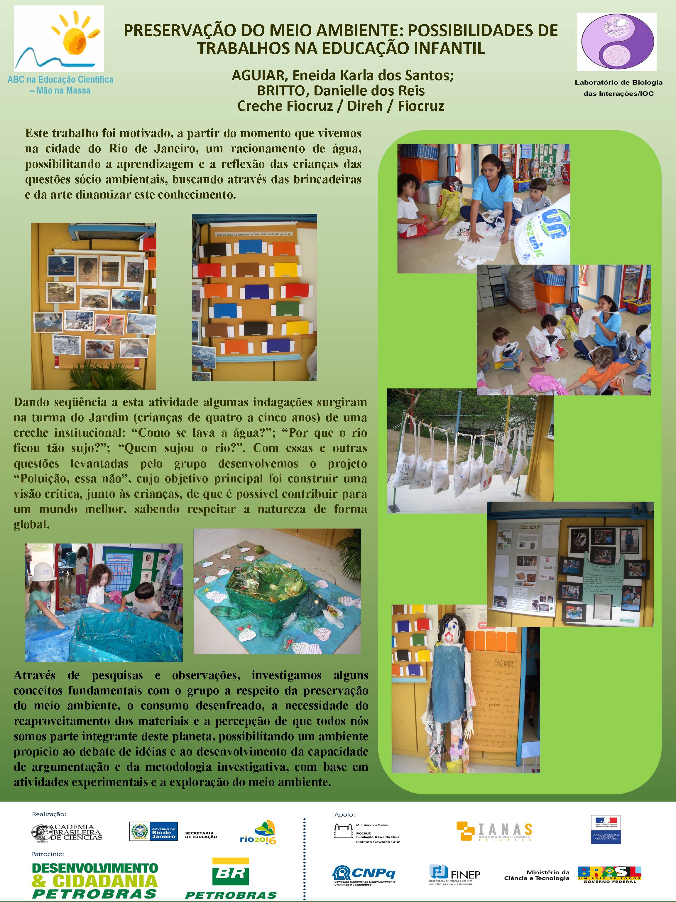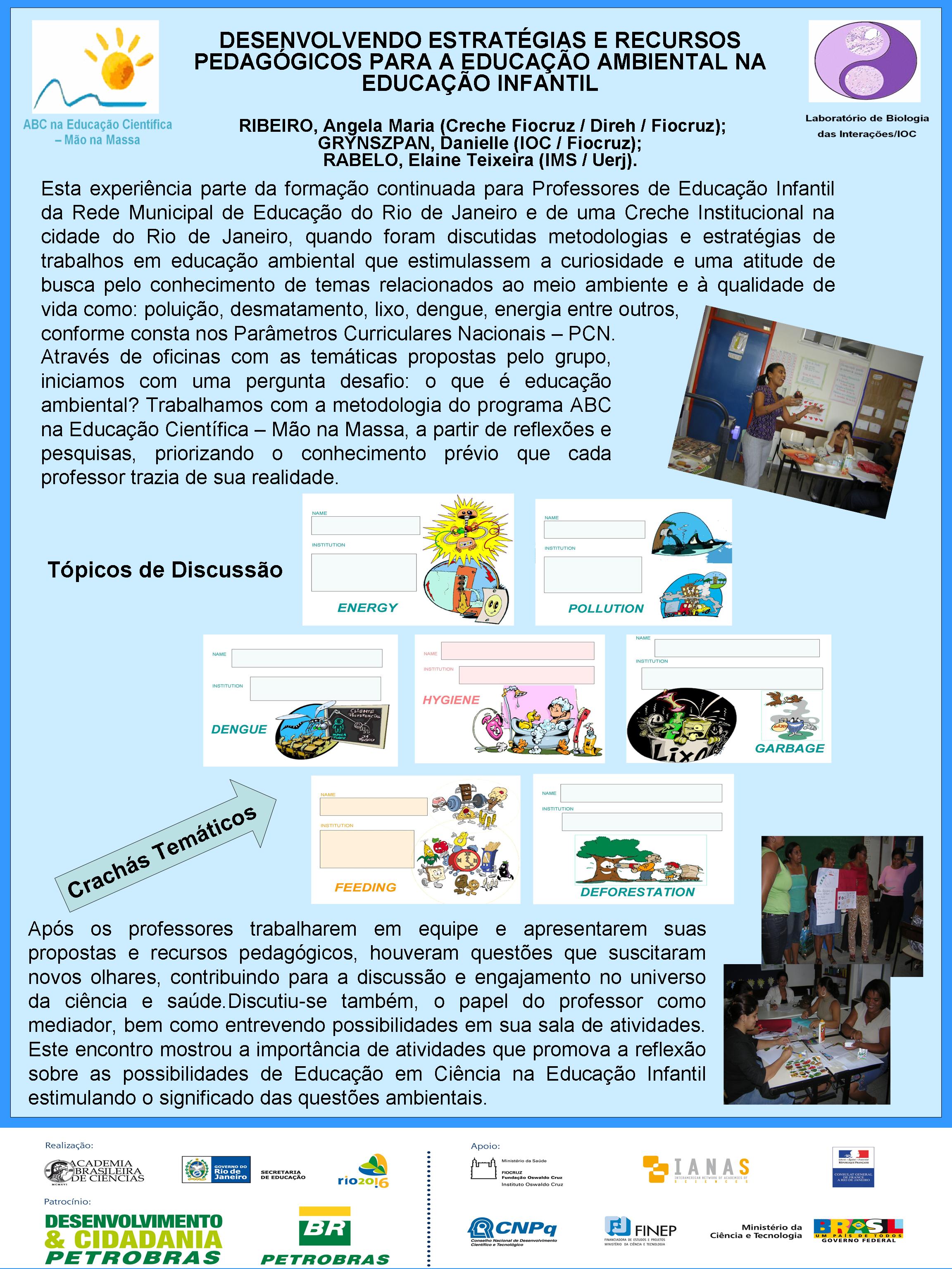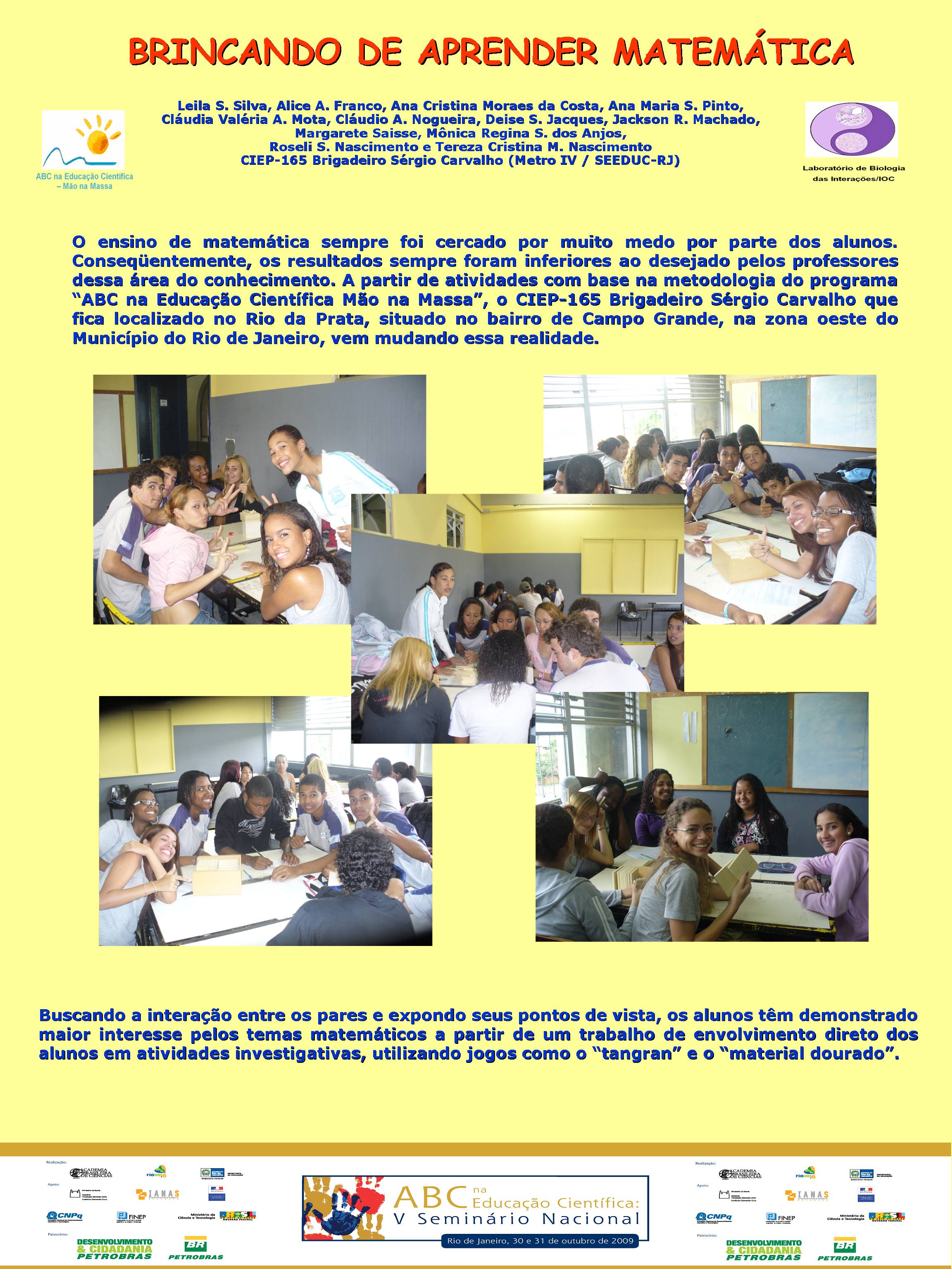 Realizado no Planetário do Rio de Janeiro, o V Seminário Nacional do Programa ABC na Educação Científica, com o patrocínio da Petrobras e apoio da FINEP, do CNPq, discutiu a atuação dos diversos núcleos do Programa, bem como a própria atuação da Academia Brasileira de Ciências na temática de educação em ciências no Brasil. Veja aqui a agenda do evento. O encontro contou com a participação dosacadêmicos Ernst Hamburger, Simon Schwartzman, Alexander Kellner e Diogenes Campos e de diversas pessoas envolvidasno Programa, como os professores Danielle Grynszpan, Aprígio Curvelo, Roseli Lopes e Dietrich Schiel. Também participaram autoridades do Ministério de Educação e da Secretaria de Educação do Estado. Durante o Seminário, também foram apresentadas, por meio de pôsteres, diversas iniciativas na área de educação científica que têm sido tomadas por professores do estado do Rio de Janeiro. Para maiores informações, acesse o relatório acadêmico. Para acessar o Levantamento Diagnóstico, clique aqui. A seguir podem ser acessados alguns dos trabalhos apresentados por pôsteres durante o evento. Afinal, somos iguais ou diferentes Menino ou menina, quem tem mais fôlego? Planeta Terra / Planeta Água Rã, sapo ou perereca? Todo ovo de galinha tem um pintinho? Ciência e arte na educação infantil: trabalhando a dengue com crianças da pré-escola A descoberta: o vento em nossa sala Descobrindo o meio ambiente através do folclore Desenvolvendo estratégias e recursos pedagógicos para a educação infantil Encontro de ciência: possibilidades de desenvolvimento e aprendizagem na educação infantil Preservação do meio ambiente: possibilidades de trabalhos na educação infantil Raízes: um encontro com a identidade e a natureza “Vida de inseto”: a educação infantil em foco Contando “causos”: resgatando histórias Escola limpa – bairro limpo Brincando de aprender matemática Qual o mistério do barbeiro? Ambiente como tema transversal – a diversidade na natureza e na sociedade Sexualidade: se liga nesse lance! De onde vem a água de nosso bairro? Gestão de resíduos integrada à educação ambiental – estratégias para melhoria da qualidade de vida em Miracema, RJ apoio_mao_na_massa.jpg