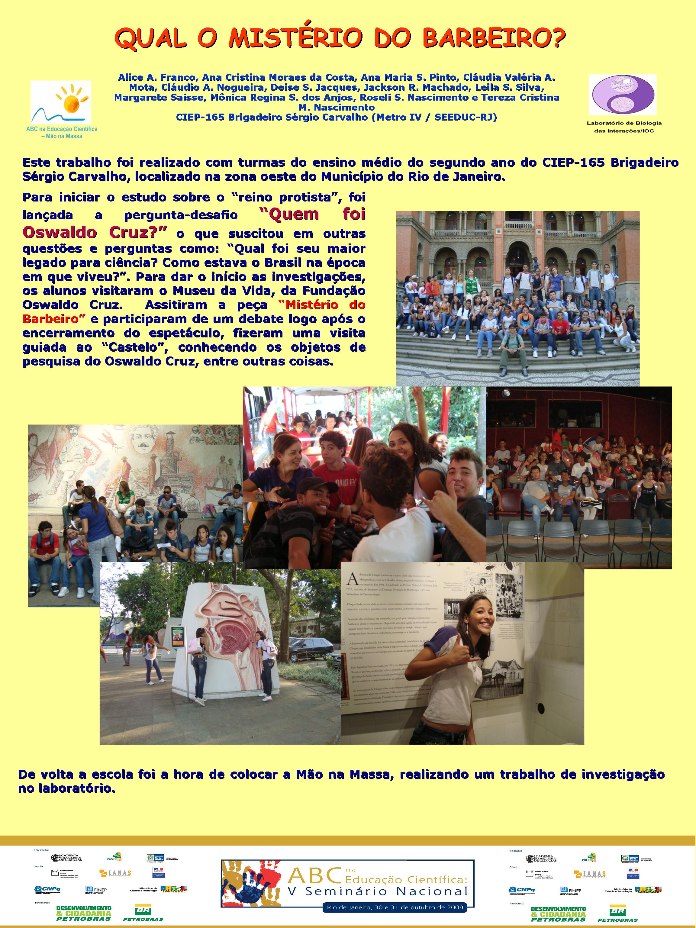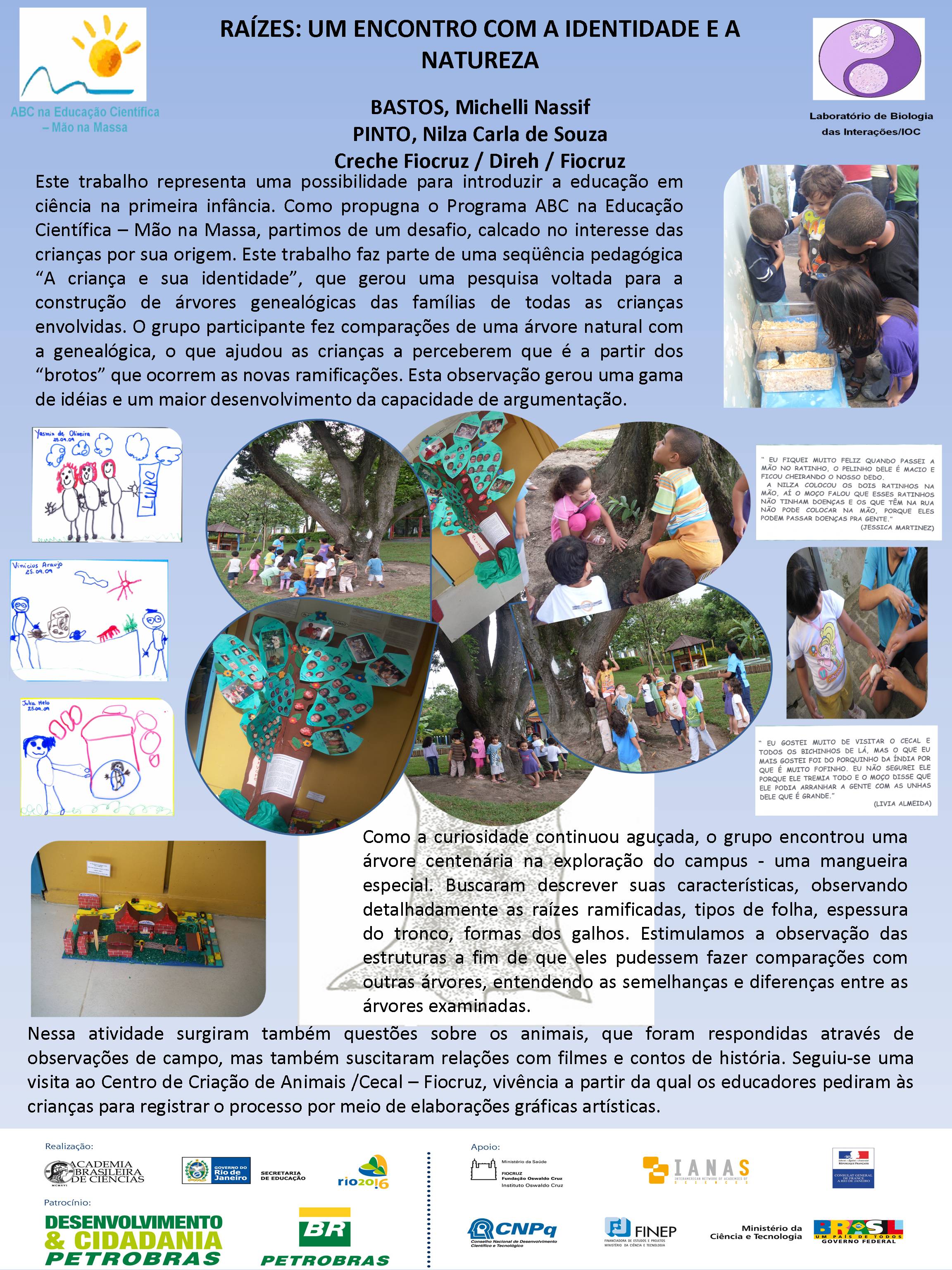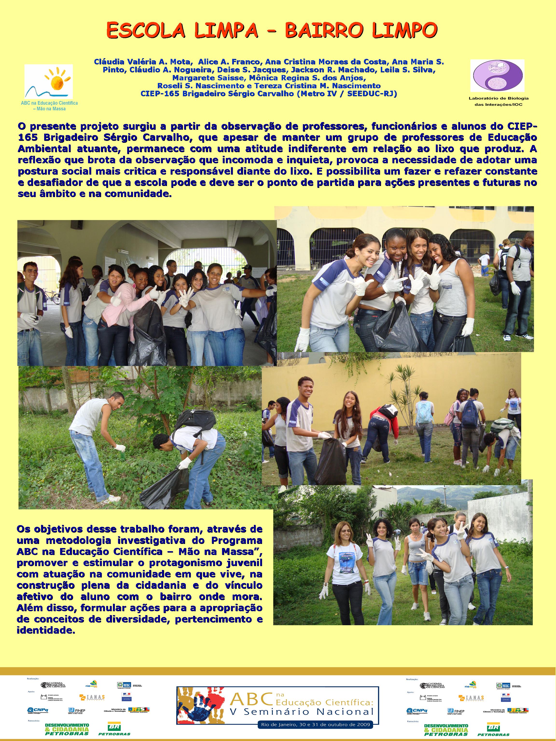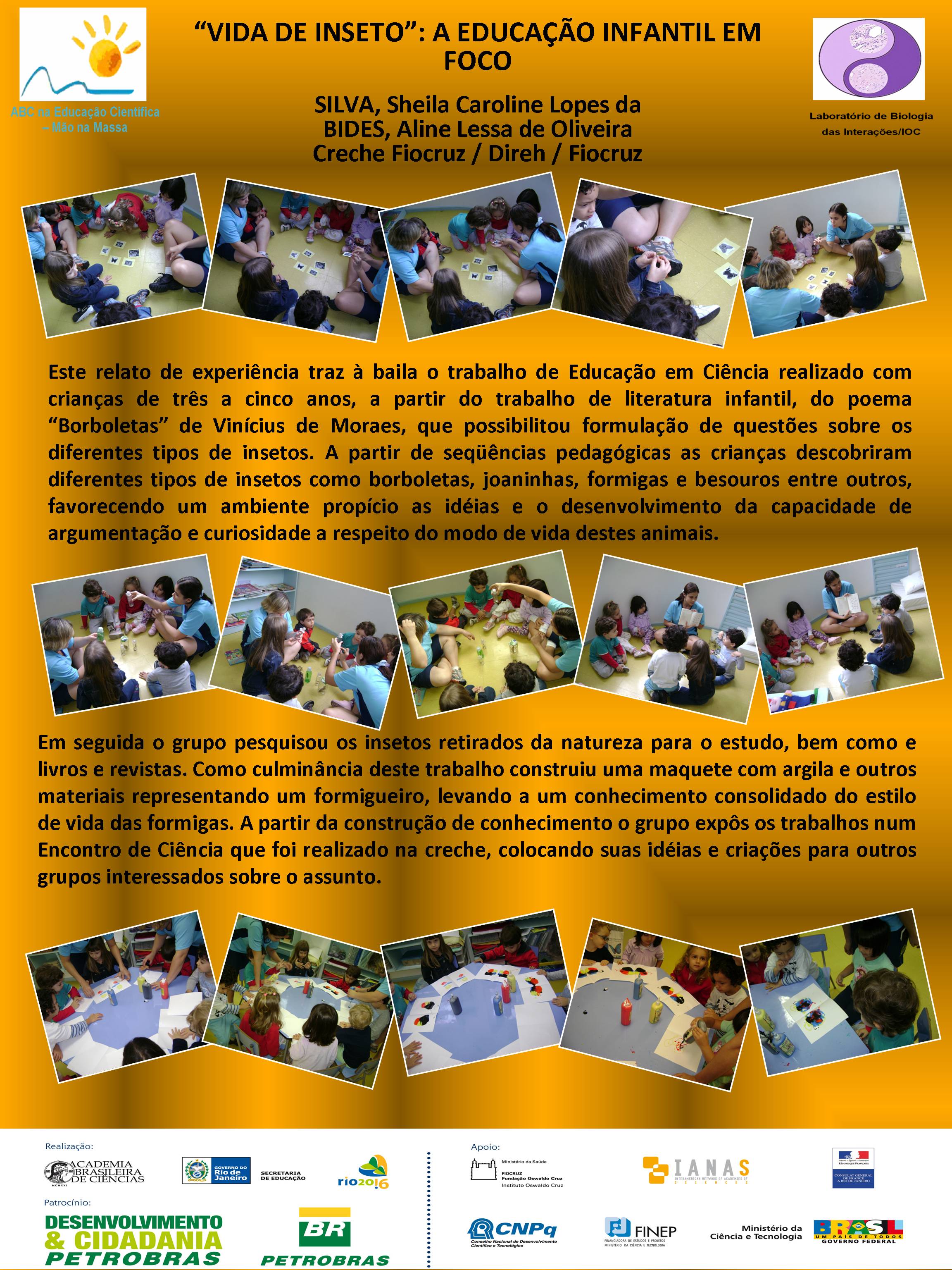 Realizado no Planetário do Rio de Janeiro, o V Seminário Nacional do Programa ABC na Educação Científica, com o patrocínio da Petrobras e apoio da FINEP, do CNPq, discutiu a atuação dos diversos núcleos do Programa, bem como a própria atuação da Academia Brasileira de Ciências na temática de educação em ciências no Brasil. Veja aqui a agenda do evento. O encontro contou com a participação dosacadêmicos Ernst Hamburger, Simon Schwartzman, Alexander Kellner e Diogenes Campos e de diversas pessoas envolvidasno Programa, como os professores Danielle Grynszpan, Aprígio Curvelo, Roseli Lopes e Dietrich Schiel. Também participaram autoridades do Ministério de Educação e da Secretaria de Educação do Estado. Durante o Seminário, também foram apresentadas, por meio de pôsteres, diversas iniciativas na área de educação científica que têm sido tomadas por professores do estado do Rio de Janeiro. Para maiores informações, acesse o relatório acadêmico. Para acessar o Levantamento Diagnóstico, clique aqui. A seguir podem ser acessados alguns dos trabalhos apresentados por pôsteres durante o evento. Afinal, somos iguais ou diferentes Menino ou menina, quem tem mais fôlego? Planeta Terra / Planeta Água Rã, sapo ou perereca? Todo ovo de galinha tem um pintinho? Ciência e arte na educação infantil: trabalhando a dengue com crianças da pré-escola A descoberta: o vento em nossa sala Descobrindo o meio ambiente através do folclore Desenvolvendo estratégias e recursos pedagógicos para a educação infantil Encontro de ciência: possibilidades de desenvolvimento e aprendizagem na educação infantil Preservação do meio ambiente: possibilidades de trabalhos na educação infantil Raízes: um encontro com a identidade e a natureza “Vida de inseto”: a educação infantil em foco Contando “causos”: resgatando histórias Escola limpa – bairro limpo Brincando de aprender matemática Qual o mistério do barbeiro? Ambiente como tema transversal – a diversidade na natureza e na sociedade Sexualidade: se liga nesse lance! De onde vem a água de nosso bairro? Gestão de resíduos integrada à educação ambiental – estratégias para melhoria da qualidade de vida em Miracema, RJ apoio_mao_na_massa.jpg